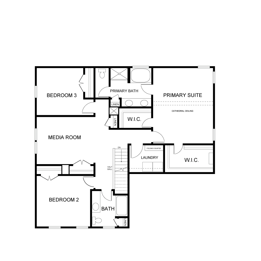 The Family Entry with cubbies and bench connects the 2 Car Garage to the powder room. Extending your entertaining space is a large covered porch located off the Great room. Several additional bonus options include a relaxing Sunroom, Screened in porch with a dramatic two-sided Gas Fireplace or a conveniently located first floor En Suite. The second floor features an Owner’s Suite with Cathedral Ceiling, two secondary Bedrooms and a media room. The large Laundry Room includes a folding counter and optional sink. Customize the Owner’s Bath with an optional Ceramic Tile Shower and Glass Partition or a Free Standing Tub. Located off the central hallway is the Media Room with the option to enclose creating a 4th Bedroom.